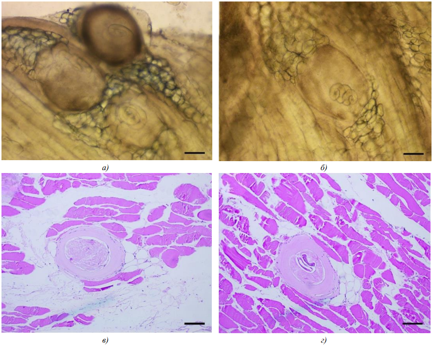 Рис. 1. Капсулы трихинелл с личинками в мышцах барсука: а, б — нативный препарат;  в, г — гистологические срезы, окрашенные гематоксилином и эозином. Масштаб: 0,1 мм